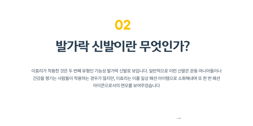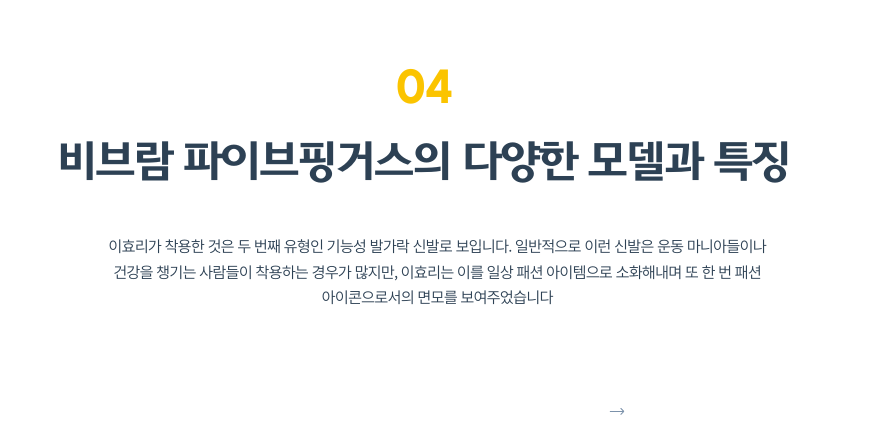 이효리가 착용한 것은 두 번째 유형인 기능성 발가락 신발로 보입니다. 일반적으로 이런 신발은 운동 마니아들이나 건강을 챙기는 사람들이 착용하는 경우가 많지만, 이효리는 이를 일상 패션 아이템으로 소화해내며 또 한 번 패션 아이콘으로서의 면모를 보여주었습니다.